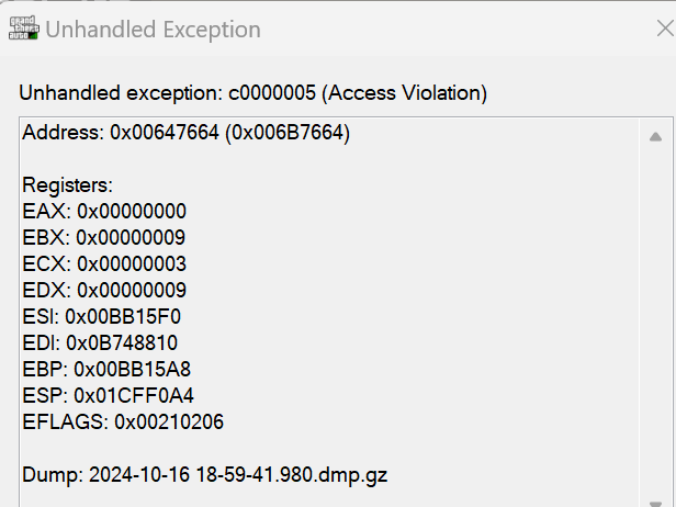 | Summary | 0000513: Error: Unhandled exception: c0000005 (Access Violation) Address: 0x00647664 (0x006B7664) - Game crashes alot. | ||||